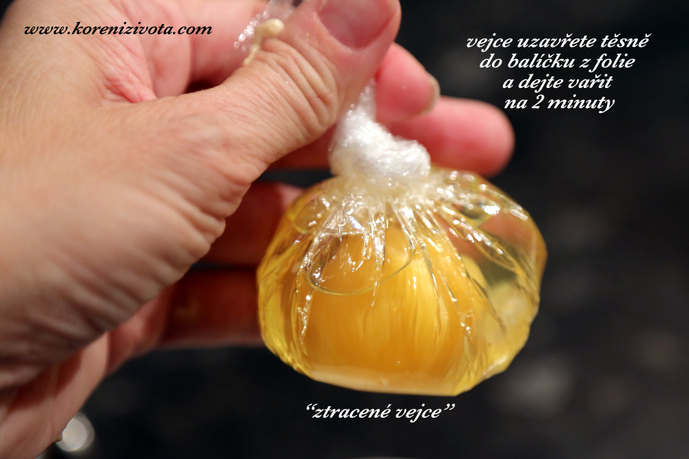 V menším širším hrnci přiveďte k varu vodu s trochou octa a stáhněte pak výkon sporáku na minimum, jen na probublávání. Malou mističku (či šálek) si vystelte kouskem potravinářské folie (můžete jí pomazat kapkou oleje zevnitř) a do ní vyklepněte celé čerstvé vejce. Vršek folie nad vejcem hezky zatočte a smotejte do uzlíku, aby vejce nevyteklo. Pokud by vyteklo, nic se neděje, neb ve vodě vaříte ocet a ten bílek stihne vysrážet.. Vroucí vodu rozmíchejte měchačkou a vytvořte vír, do jehož středu pak vložte „vaječný balíček“. Udržujte vír měchačkou po dobu 2-3 minut, kdy budete vařit ztracené vejce. Vyndejte ztracené vejce děrovanou naběračkou a opatrně ho vyloupněte z folie (oloupejte ji). Ztracené vejce servírujte okamžitě, dokud je žloutek lehce tekutý. Pokud chcete i další inspiraci, kde ztracené vejce použít, tak mrkněte třeba na tuhle luxusní kulajdu – klikněte ZDE.