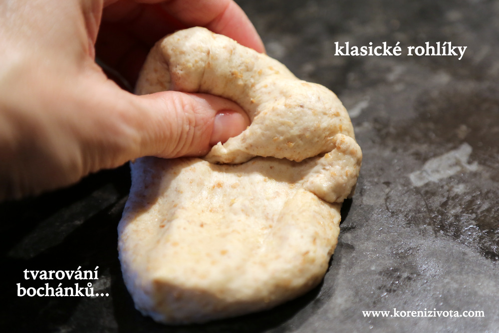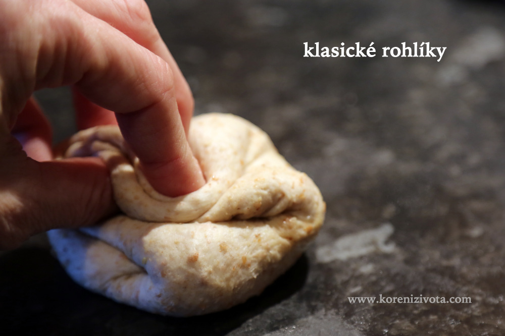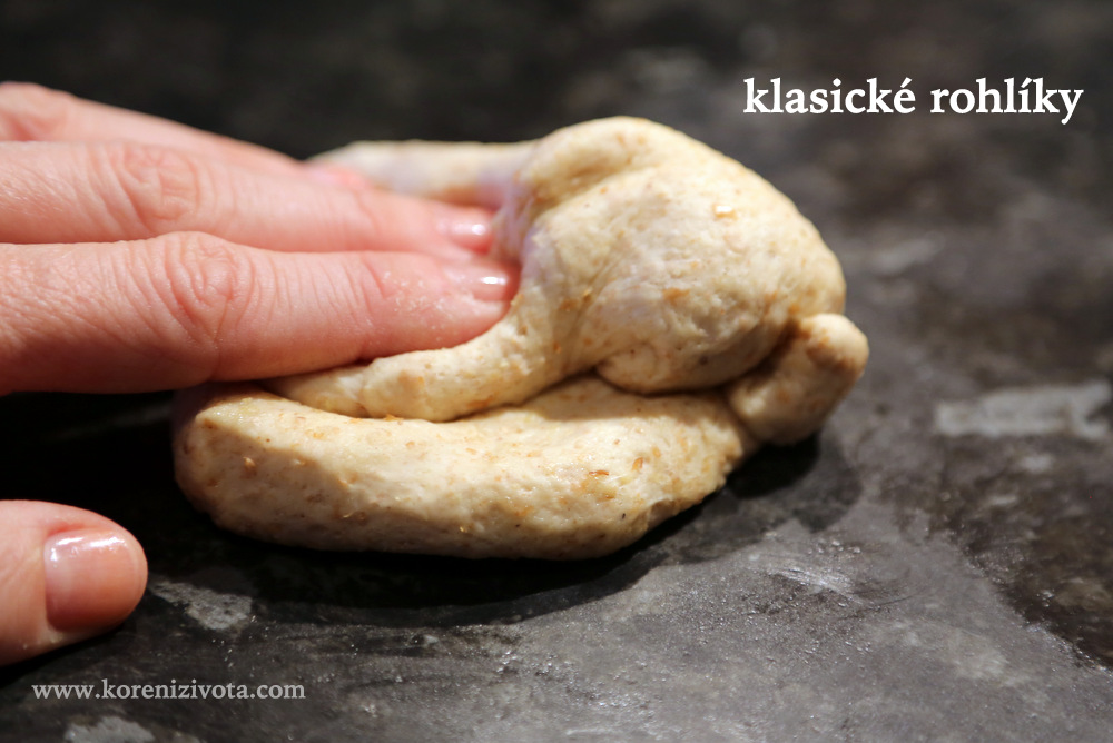Švy se krásně spojí a nebudou se vám odchlipovat cípy rohlíků při pečení. jedná se o tzv. “utahování”. Když přitlačíte u konců rohlíku, tak se vám vytvoří krásné špičky, co se do křupava vypečou. Pokud ne, tak budete mít takové kulaté špičky, jako vidíte u mne na obrázku. Každý má rohlíky rád jinak křupací 😉 . Pokud to vydržíte a nebudete podsypávat těsto moukou, tak rohlíky krásně utáhnete a budou i při pečení držet krásně tvar anebudou mít tendenci se rozbalovat.