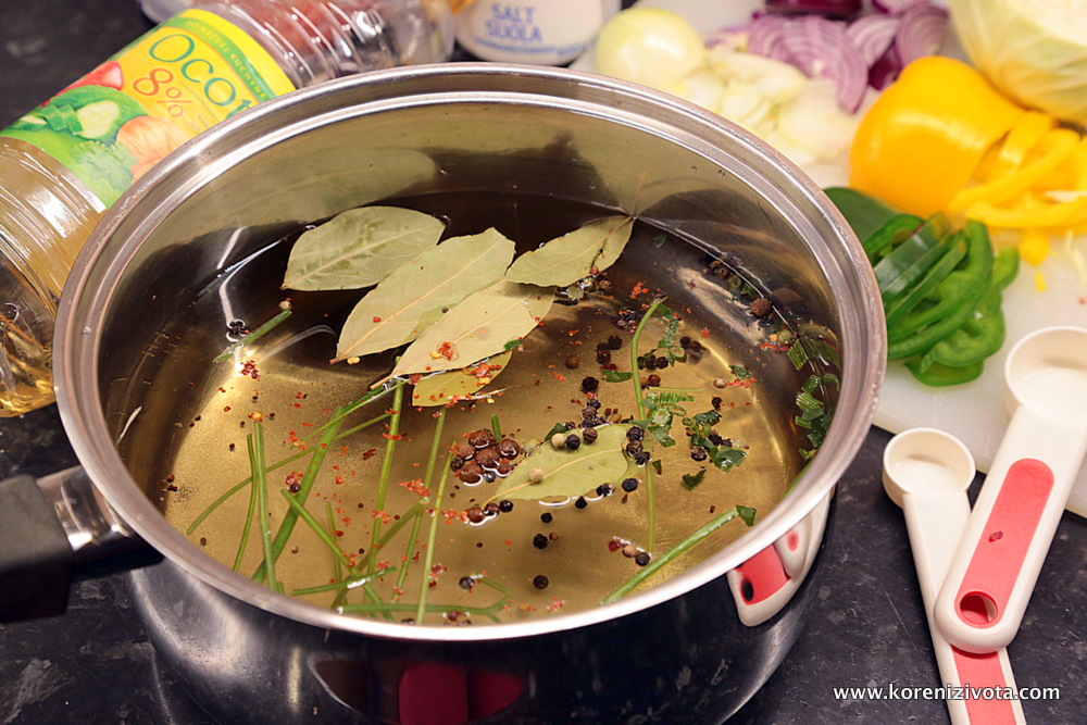 Suroviny na nálev dejte do hrnce a přiveďte k varu. Nechte celé mírně probublávat zhruba 5 minut. Pak nálev odstavte a nechte vychladnout. Před použitím ho slijte přes sítko, aby jste odstranili koření. Bobkový list si ale ponechte, ještě ho použijete.