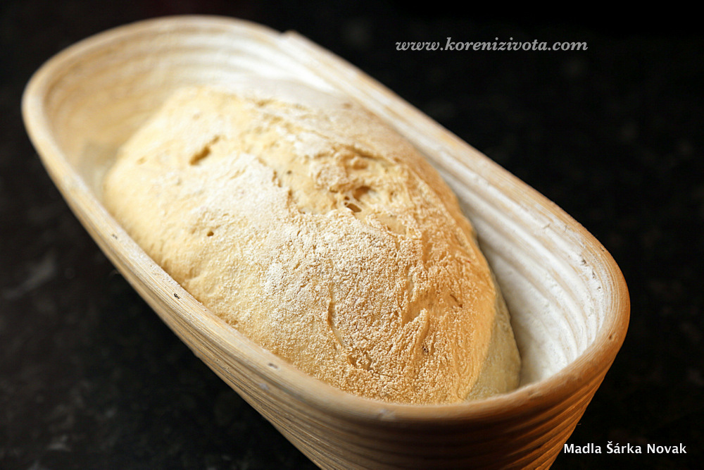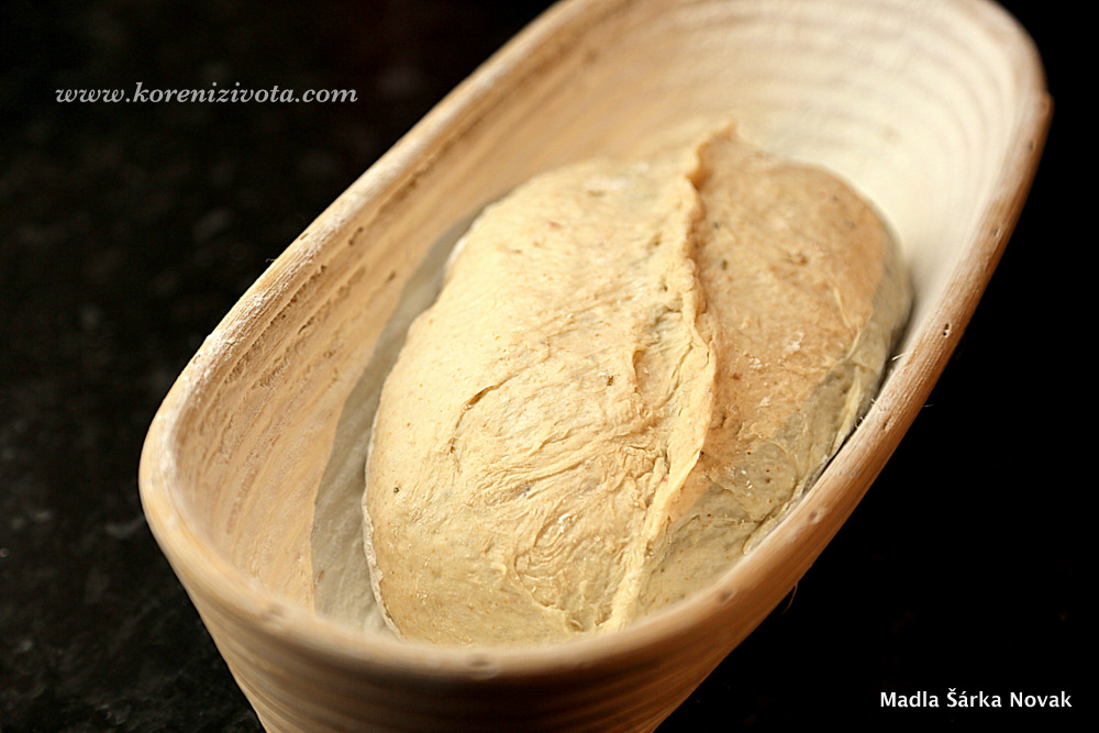 Chleba tedy potřebuje odpočinout, pouze 3 x 50 minut (jen 2 x) se překládá. Teprve pak těsto vytvarujte stočením do požadovaného tvaru (podle ošatky či cedníku, ve které těsto bude závěrečně kynout). Dejte si na čas. Nejdříve chleba předtavrujte, nechte 45 minut odpočívat pod mísou. Následně precizně bochníček “utáhněte” táhlými pohyby směrem k sobě ze všech směrů po lehoulince pomoučněné pracovní ploše tak, aby se vytvořilo správné povrchové napětí těsta. Pak pecen nebude mít tendenci praskat či tvořit různé “jeskyně” během pečení.