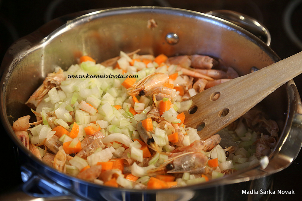 - zprudka osmahněte krevetové krunýře a přidejte zeleninu