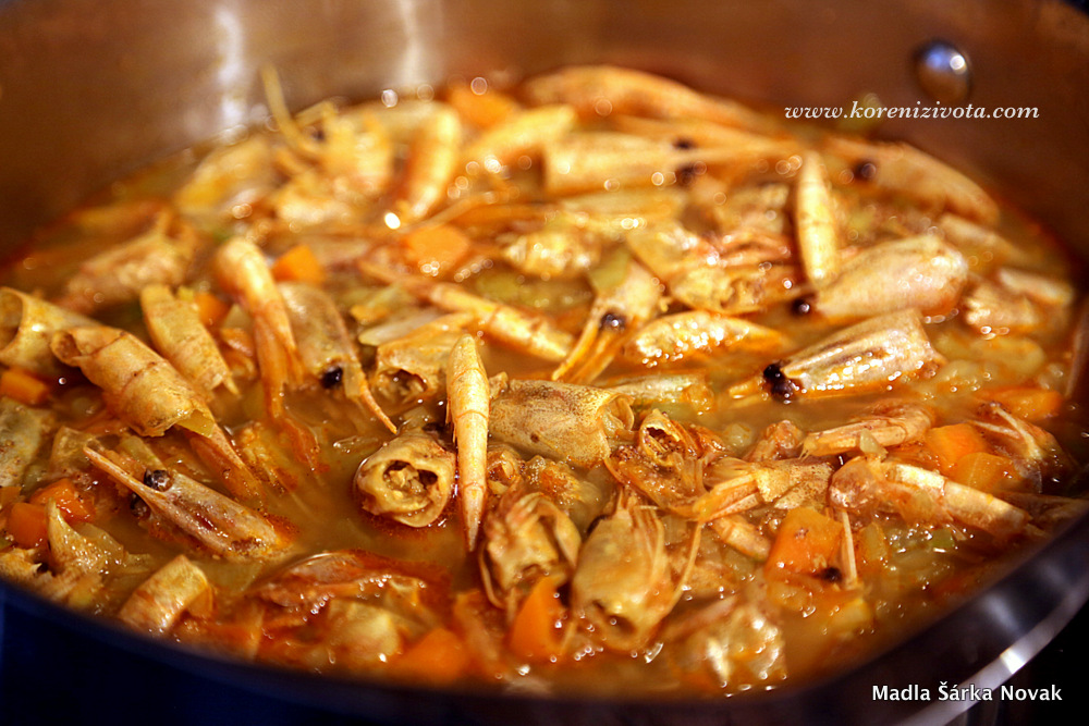 Nyní je čas adventní, kdy se tady ve Skandinávii setkáváme s přáteli a servírujeme si navzájem různé cizokrajné delikatesy. Dost často se teď stává, že v obchodech jsou k dostání lehce předvařené a hluboko zmražené krevety doslova za pár korun. A protože na nás tentokrát vyšla řada s předvánoční večeří pro přátele a sousedy, tak jsem vybrala následující recept z krevetových krunýřů (a ani maso nepřijde na zmar). Snadná rybí polévka z krevetových krunýřů je hotová během půl hodiny. Věřte, že připravíte luxusní pokrm s minimem námahy! Recept pochází (s pár úpravami , jak jinak..) od švédské kuchařské legendy jménem Leif Mannerström (za drobné úpravy se mistrovi omlouvám, ale nemohla jsem odolat). On tvrdí, že pokud krunýře vyhazujete, tak mu máte okamžitě udat svou adresu a on si pro ně přijede a jako bonus si to s vámi “vysvětlí” 😀 .