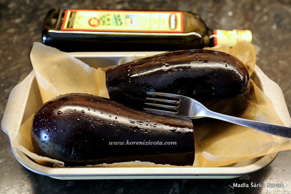 Rozehřejte troubu na 230°C. Opláchnuté a osušené lilky potřete olivovým olejem. Pěkně je namasírujte a pak je na několika místech propíchejte vidličkou, aby vám v troubě neexplodovaly. Pak jim ještě uřízněte zelené konce. Pečte je cca 1 hodinu s tím, že každých 15 minut je lehce pootočte, aby se propekly rovnoměrně a nepřipálily se. Dužnina během pečení krásně změkne, ikdyž lilky už nebudou tak foremné. Po upečení je nechte zlehka vychladnout.